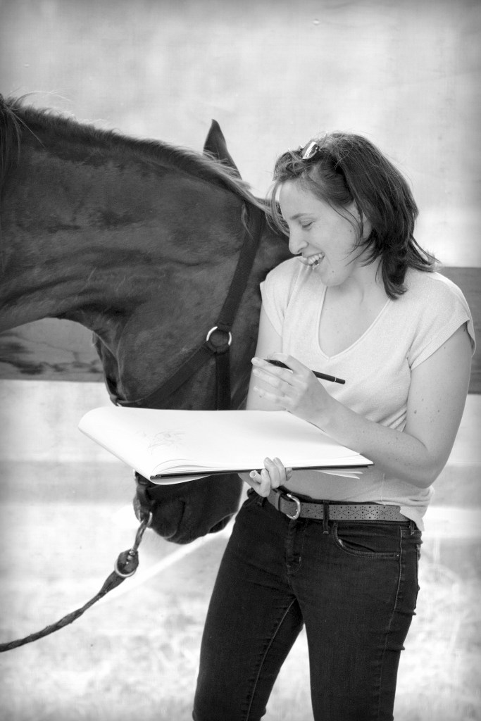 Brigitte dessine en tous lieux et par tous les temps ! Elle découvre notamment à quel point le cheval est expressif, ce qui rappelle le travail du portrait, appréciant d’être dessiné et d’être au centre de l’attention. La relation entre l’homme et l’animal, les corps qui se répondent et le mouvement se rapprochant d’une danse constituent des objets de recherche inlassable dans le dessin.